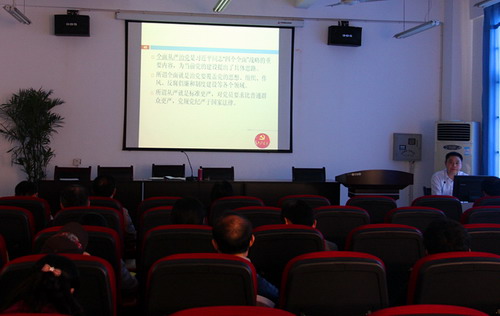 我校思政部马克思主义中国化教研室余建明副教授从《党章》的历史发展、新《党章》的特点和主要内容、贯彻《党章》,在全面从严治党中做“四讲四有”的合格党员三个方面,旁征博引,深入浅出地对《党章》进行了解读。