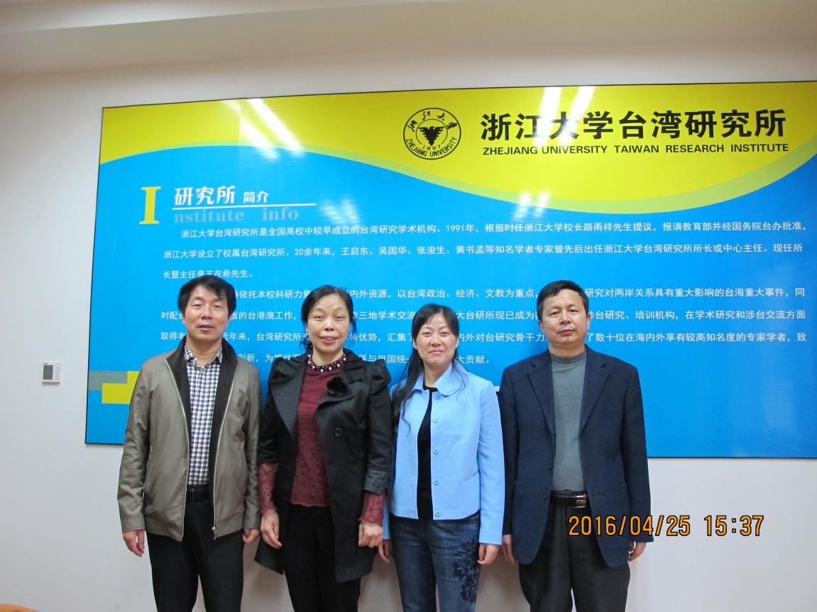 在浙江大学,汪力平主任带领一行四人考察了浙江大学台湾研究所,并与浙江大学台湾研究所副所长孔小惠博士就台湾研究的相关内容及其国际形势进行了深入交流,社会系统研究中心常务副主任冷树青博士还认真了解台湾研究所的相关运行机制,深受启发。