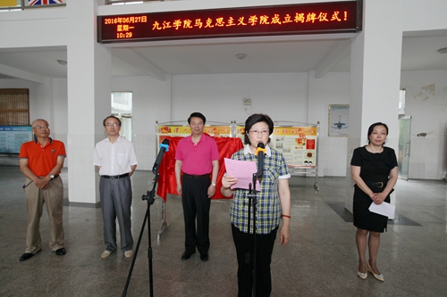 吴桃娥副校长宣读了《中共九江学院委员会关于思想政治理论课教学科研部更名的通知》。随后发表致辞,她说,九江学院“马克思主义学院”揭牌,是我校马克思主义理论学科建设乃至我校建设史上的一件大事,马克思主义学院的成立,必将促进我校马克思主义理论课教育教学与学科建设工作进入新的发展阶段。