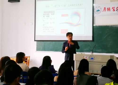 课后,杨副校长对本节课教学进行了点评。他认为赵文老师的授课层次清楚、节奏把握较好,教学信息量大,教学过程流畅。一是通过问题导入新课,利用讲时事、学生点评、教师总结这种方式,将理论知识变得生动活波,并结合社会主义核心价值观进行教学引发同学们深入思考,效果良好。二是PPT课件图文并茂、史料丰富,视频运用得当,充分吸引了同学们的注意力又帮助同学们深入理解教学内容。杨副校长还引用了三代领导人讲话以及《平“语”近人》中的经典语句与同学们共勉,希望同学们不仅在学习上,而且在“赶考、合格、毕业”的人生道路上,认真做人做事,做一个合格的社会主义建设者和接班人。