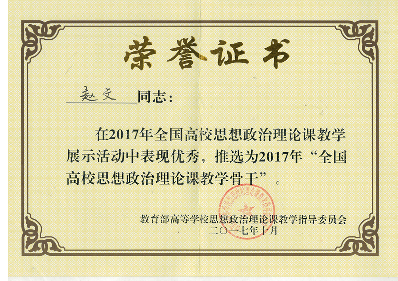 3.以课堂优化为核心开展课程建设。赵文同志参加了2017年“全国高校‘概论’课现场教学展示”活动、教育部建设学习贯彻党的十九大精神“名师示范课堂”和江西省“特色示范课程”活动;参加2016年江西省高校思想政治理论课优秀教案评选活动并获二等奖。