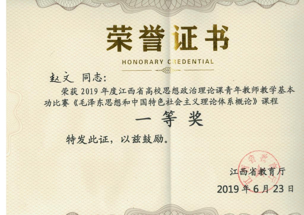 2.以能力提升为目标参加教学竞赛。赵文同志获江西省高校思政课青年教师教学能手选拔赛一等奖1次、二等奖1次、三等奖2次;获第三届省高校青年教师教学竞赛二等奖、省“弘扬井冈山精神与当代大学生成长”说课比赛二等奖。