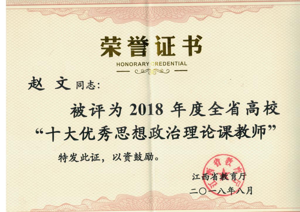 赵文同志从教以来一直坚持以优秀人民教师的标准严格要求自己,时刻忠诚于党的教育事业,关心学生、用心教学、潜心学术,在教书育人、科学研究等方面都取得了一定的成绩:入选2018年教育部“优秀中青年思政课教师择优资助计划”,荣获2017年“全国高校思政课教学骨干”、2018年江西省高校十大“优秀思政课教师”、2019年江西省模范教师、2019年中共九江市直属机关优秀共产党员等荣誉,2017-2018年连续两年考核优秀、连续两年获评校优秀教师,获2018年“新华优秀教师奖”。赵文同志以勤勤恳恳、兢兢业业的工作态度,彰显了一名新时代青年教师的应有风采。