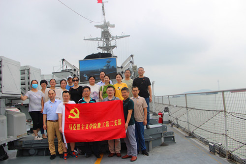 在九江舰爱国主义教育基地,大家爬舷梯、登甲板,近距离观看了“九江舰”的火箭炮、舷窗等区域,详细了解了九江舰的英雄航迹和我国海军改革发展的光辉历程等情况。通过参观学习,大家接受了一次生动的爱国主义教育,更加深刻体会到国家军队的强大,深觉当今国家安全的来之不易。大家纷纷表示,作为一名高校思政课教师,要以军人不怕苦不怕累的精神为榜样,发扬艰苦奋斗精神,永葆共产党人本色,以强烈的责任感和使命感,在工作中践行初心和使命,做到守土有责、守土尽责,承担起学生健康成长指导者和引路人的责任,把立德树人的根本任务真正落实到位。
