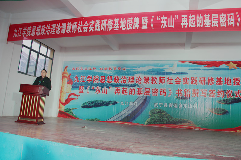 2020年1月10日,九江学院思政课教师社会实践研修基地授牌仪式在学校扶贫点武宁县官莲乡东山村举行。校党委委员、副校长查振华、武宁县官莲乡党委负责人、乡长邓卢武出席仪式,学校全体帮扶干部、驻村工作队,东山村村两委、党员群众代表共计100余人参加了活动。活动由驻村干部、外语学院团委书记江山主持。这是马克思主义学院“红色研学”活动又一项新举措。