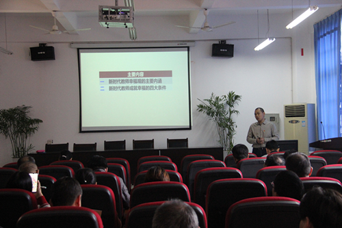 会上,赵文博士以“不忘初心、牢记使命,争当幸福的人民教师——学习习近平总书记的奋斗幸福观”为题,围绕“新时代教师幸福观的主要内涵”和“新时代教师成就幸福的四大条件”两方面内容重点诠释了“教师的职业幸福”及“如何成为一名幸福的教师”。赵文博士指出:教师的幸福是一种全面真实的幸福,源于教师对专业发展的追求。当一个人以内在的价值和自主选择的方式来追求目标并实现时,一个人的主观幸福感就会增加。