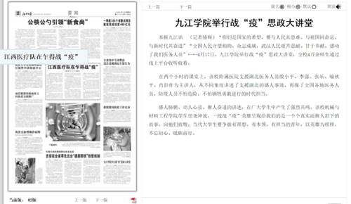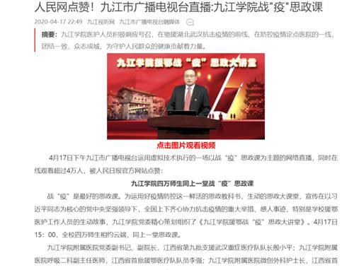 人民日报、中国新闻网、江西日报、江西教育、江西新闻客户端、九江新闻头条、九江发布、九江视听网等主流媒体以《九江学院四万师生同上一堂战“疫”思政课》《这堂特殊课,“课堂”里坐上了四万大学师生》《相约云端!九江学院四万师生同上一堂战“疫”思政课》为题转载报道本次思政大讲堂。4月20日晚,江西卫视、江西教育电视台全省教育新闻播出《九江学院援鄂战“疫”思政大讲堂》新闻节目。