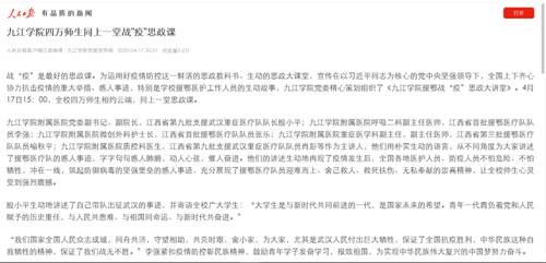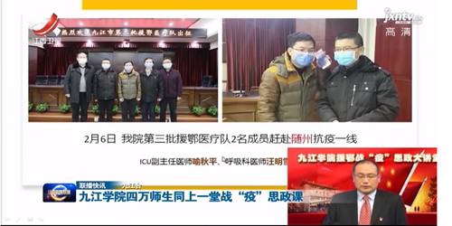 近日,由学校党委主办,党委宣传部精心策划组织承办,附属医院援鄂医护人员主讲的《九江学院援鄂战“疫”思政大讲堂》在我校四万师生和社会各界产生了强烈的反响和共鸣,同时也得到了人民日报等多家中央及省市主流媒体的热切关注。