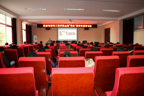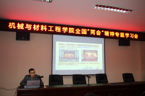 3月27日下午,机材学院在机械楼206会议室召开2019年全国“两会”精神专题学习会,邀请了马克思主义学院赵文博士作辅导报告。机材学院全体教职工参加会议,报告会由学院党委书记陈胜才主持。
